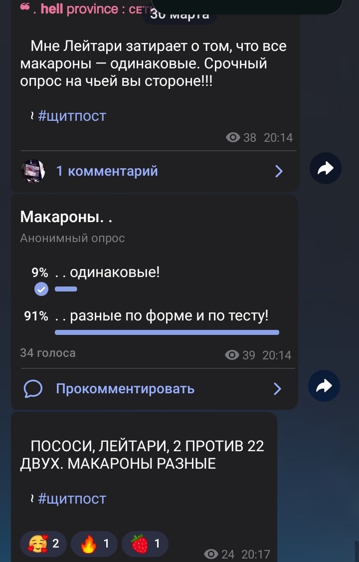Этот конфликт начинался безобидно. Скинула она мне фотографию варёных макарон, а я и говорю "а почему без сыра", А ОНА МНЕ "ЭТИ МАКАРОНЫ ЕДЯТ БЕЗ СЫРА". Я ВОЗМУТИЛСЯ! ВЕДЬ КАК ТАК МАКАРОНЫ И БЕЗ СЫРА, НО ПРОИГНОРИРОВАЛ... ЕЩЁ С ТОГО МОМЕНТА ОНА ПОЛУЧИЛА ЭТО КЛЕЙМО В ШУТКУ!!!! НО СЕЙЧАС Я СЕРЬЁЗЕН КАК НИКОГДА! НТКТО НЕ СМЕЕТ ПЕРЕХОДИТЬ ДОРОГУ ЛЕЙТАРИ И ЕГО МАКООНАИ С СЫРОМ.
