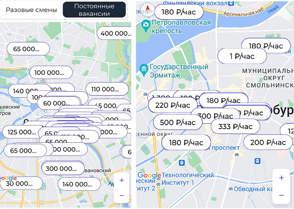 В приложении есть разовые работы от частных лиц, насколько я поняла, и есть вакансии на постоянную работу от организаций.