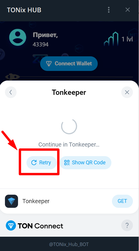 3. Если Tonkeeper кошелёк долго не подгружается, нажмите на кнопку Retry