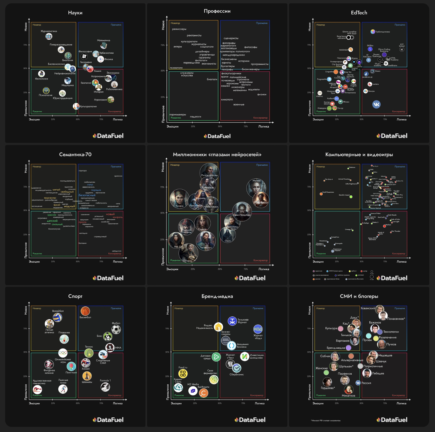 На 10 месте подборка из 9 психографических карт, которые обогатили наше общее понимание психотипов. Здесь ссылки на карты EdTech, блоггеров, науки, спорта и другие любопытные данные о связи психотипов с разными сферами ваших интересов: