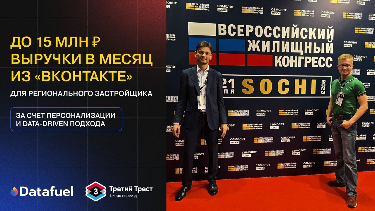 И лидером ТОП-10 стало выступление нашего генерального директора Александра Рассказова и представителя застройщика ГК “Третий Трест” (Уфа) Дмитрия Смирнова на Всероссийском Жилищном Конгрессе в Сочи. Тема выступления: какие digital-каналы и маркетинговые инструменты приносят сделки застройщику в 2023 году. Тезисно рассказали о том, как работается с площадкой «Вконтакте», и каких успехов удалось достичь. А также откровенно поделились трудностями и секретами их преодоления, которые позволили выйти на результат до 15 млн выручки из ВК в месяц.