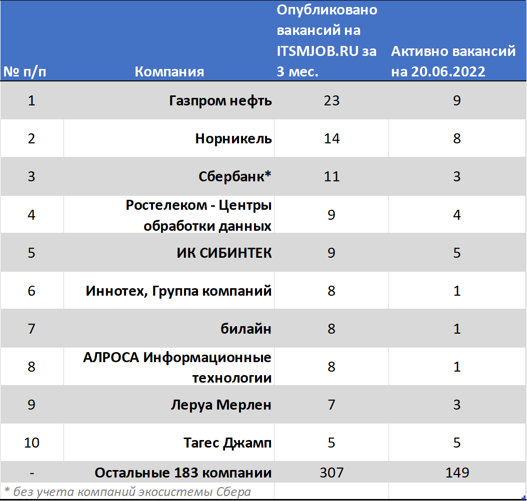 * если брать в учет компании экосистемы Сбербанка, то вероятно в совокупности количество опубликованных вакансий Сбербанка займет 1 место.