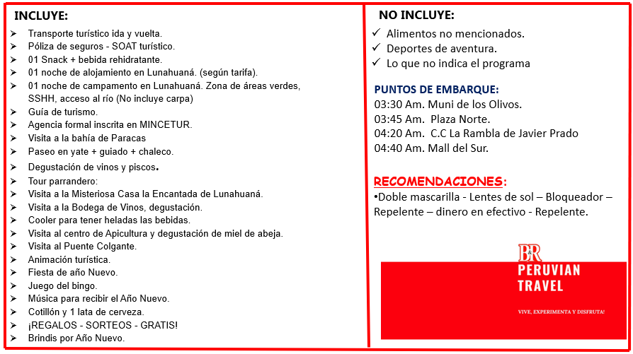 Se hara una visita a la casa encantada, luego nos iremos con rumbo a lunahuana donde se hara la instalacion y armado de carpas.