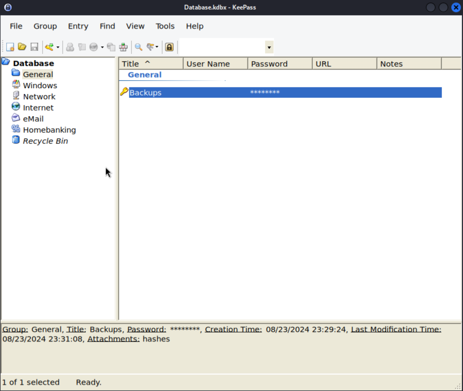 ┌──(kali㉿kali)-[~/Desktop] └─$ keepass2john Database.kdbx > bruteforce && john bruteforce Using default input encoding: UTF-8 Loaded 1 password hash (KeePass [SHA256 AES 32/64]) Cost 1 (iteration count) is 60000 for all loaded hashes Cost 2 (version) is 2 for all loaded hashes Cost 3 (algorithm [0=AES 1=TwoFish 2=ChaCha]) is 0 for all loaded hashes Will run 4 OpenMP threads Proceeding with single, rules:Single Press 'q' or Ctrl-C to abort, almost any other key for status Warning: Only 6 candidates buffered for the current salt, minimum 8 needed for performance. Almost done: Processing the remaining buffered candidate passwords, if any. Proceeding with wordlist:/usr/share/john/password.lst nothing (Database) 1g 0:00:00:02 DONE 2/3 (2024-09-04 07:12) 0.3984g/s 496.4p/s 496.4c/s 496.4C/s frodo..barbara Use the "--show" option to display all of the cracked passwords reliably Session completed.