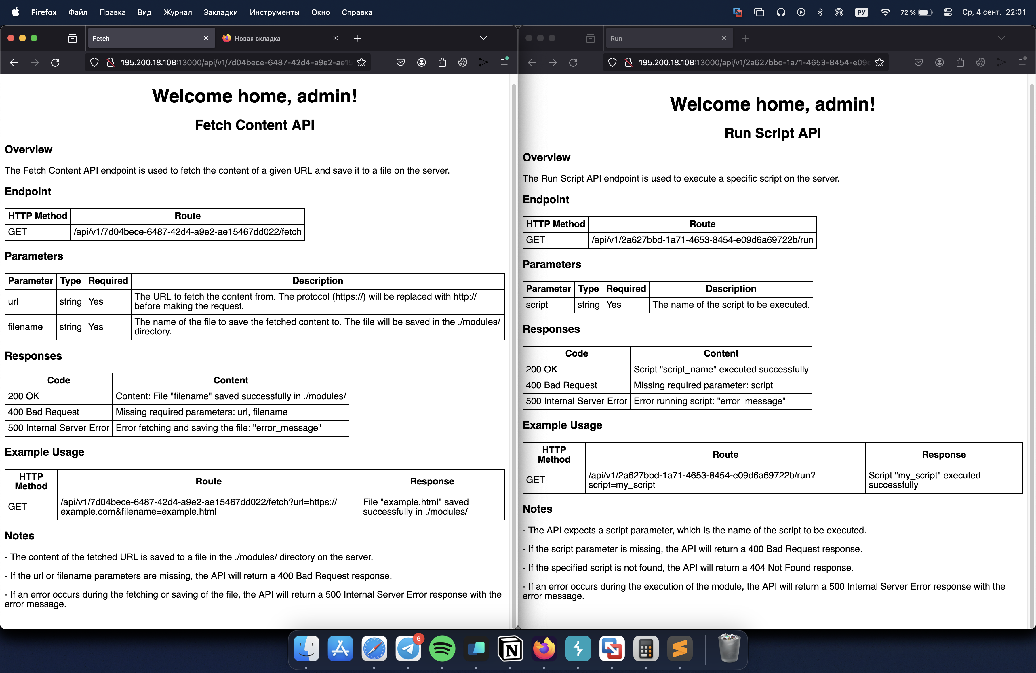 Во вкладке Admin Page видим API: