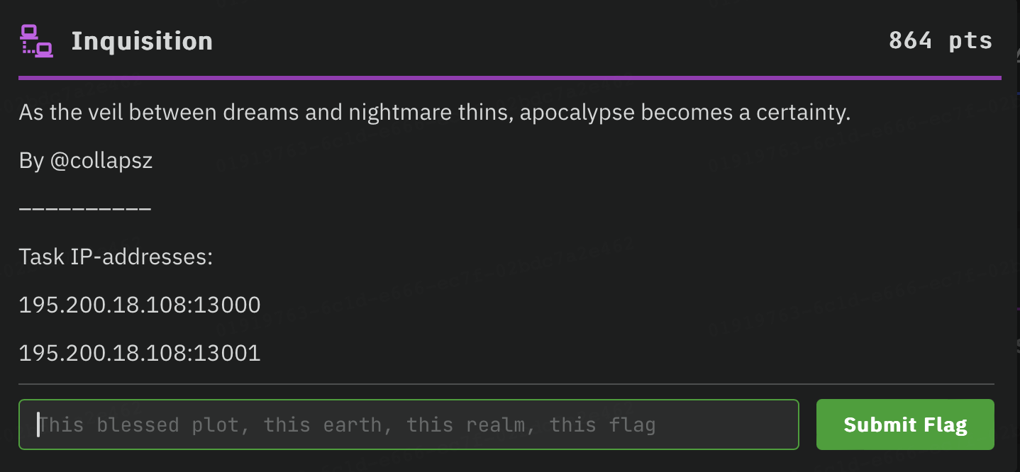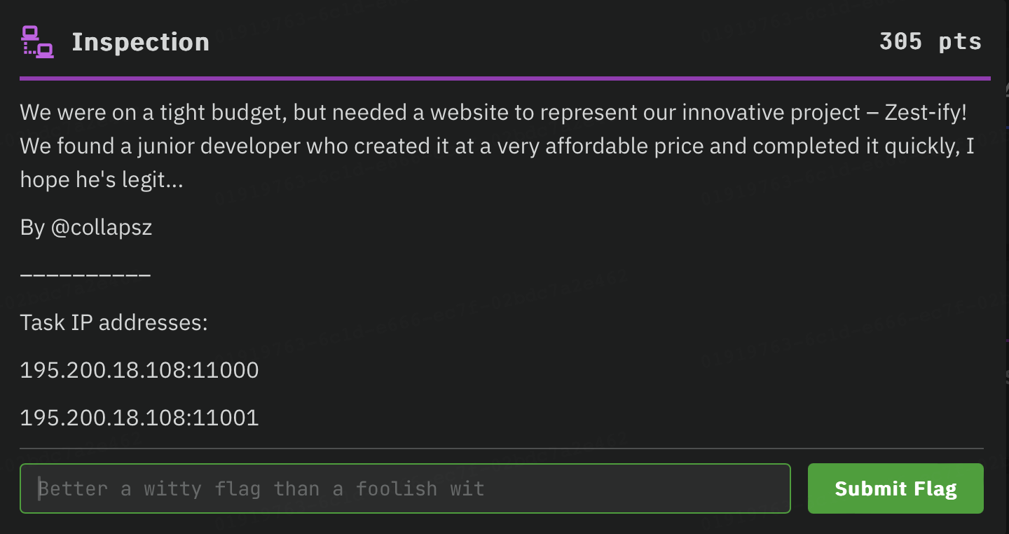 Начнем с комнаты легкой сложности, с которой справились 14 команд – Inspection. В описании к заданию даны два порта, можно их, конечно, просканировать, но во всех трех комнатах на портах висит два сервиса – веб и ssh соответственно