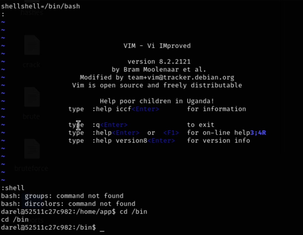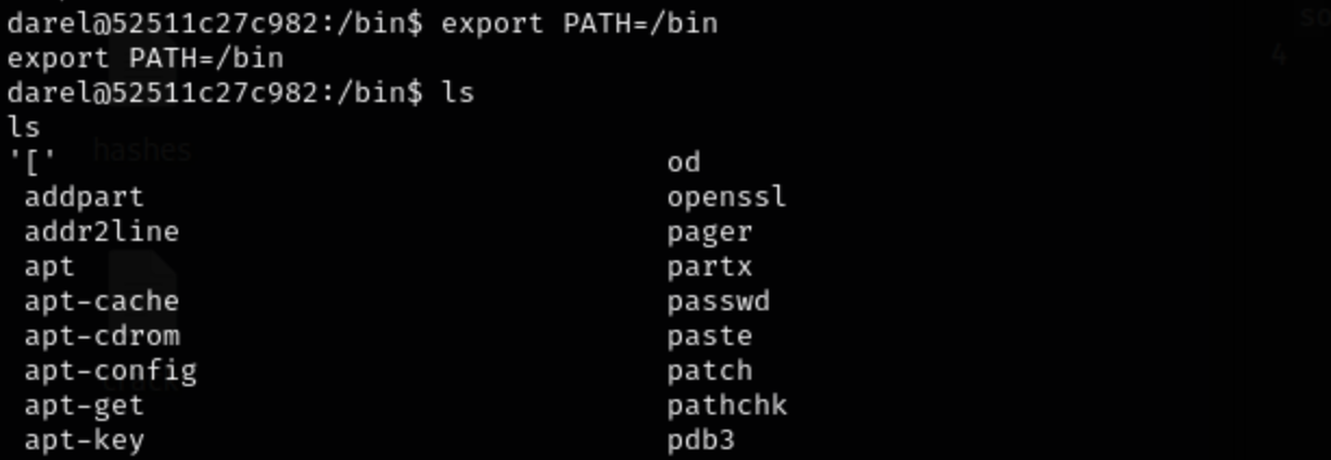 darel@52511c27c982:/home/app$ id uid=1000(darel) gid=1000(darel) groups=1000(darel) darel@52511c27c982:/home/app$ cd / rbash: cd: restricted darel@52511c27c982:/home/app$ ls rbash: ls: command not found darel@52511c27c982:/home/app$ cat app.py rbash: cat: command not found darel@52511c27c982:/home/app