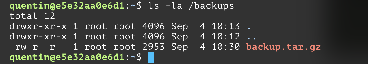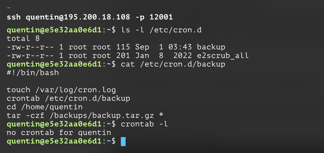 quentin@e5e32aa0e6d1:~$ ls -la /tmp total 1372 drwxrwxrwt 1 root root 4096 Sep 4 10:34 . drwxr-xr-x 1 root root 4096 Sep 4 10:12 .. -rwsr-sr-x 1 root root 1396520 Sep 4 10:34 bash
