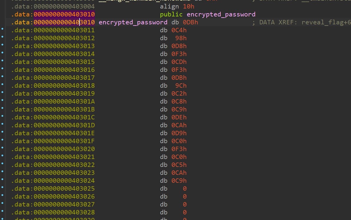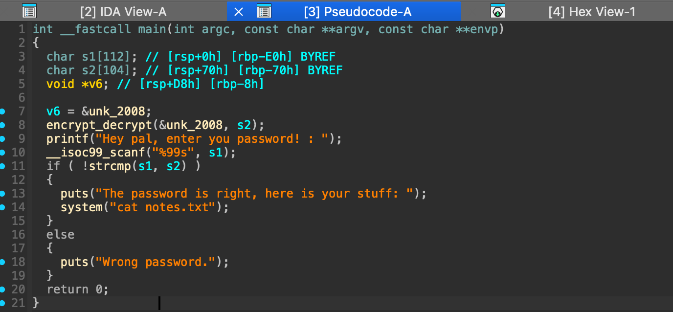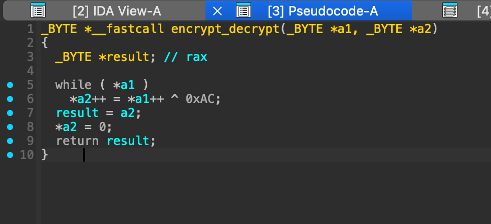 !strcmp(s1,s2)вызывается функция encrypt_decrypt, которая расшифровывает байты пароля из памяти путем ксора с0xAC: