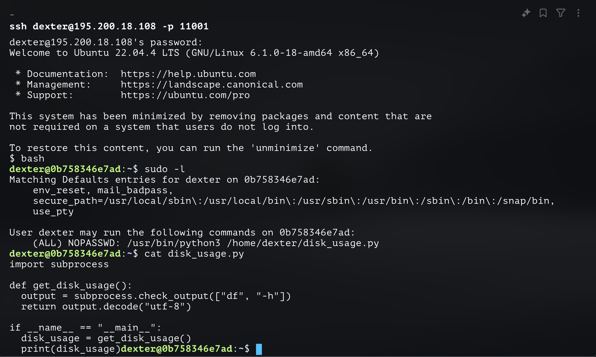 Подключаемся по ssh с полученными кредами dexter:s2cr2t_p255_f0r_ssH. Первым делом после этого проверяем sudo -l и видим, что можем от имени пользователя запускать безобидный скрипт, который выполняет системный вызов df -h (проверяет свободное место на диске) при помощи библиотеки subprocess.