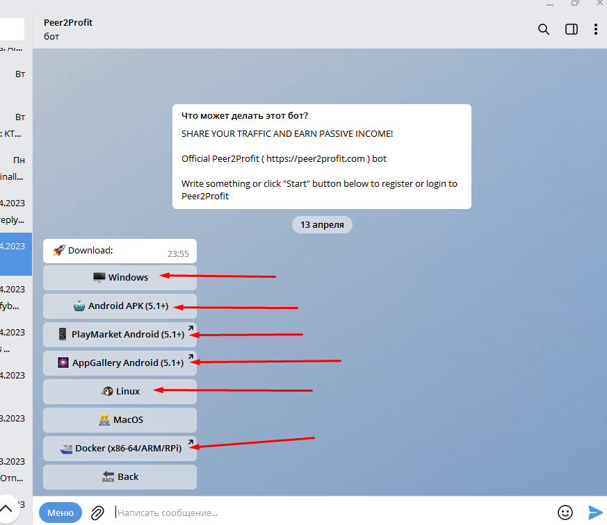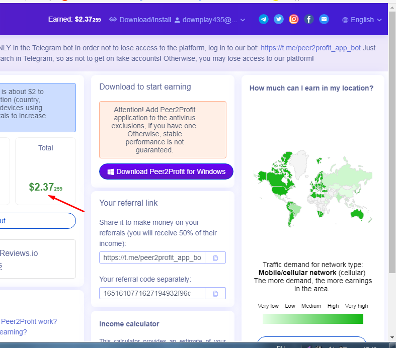 I installed the program on all my devices, and in order for your wallet to earn money, it must constantly work with the Peer2Profit program running.
