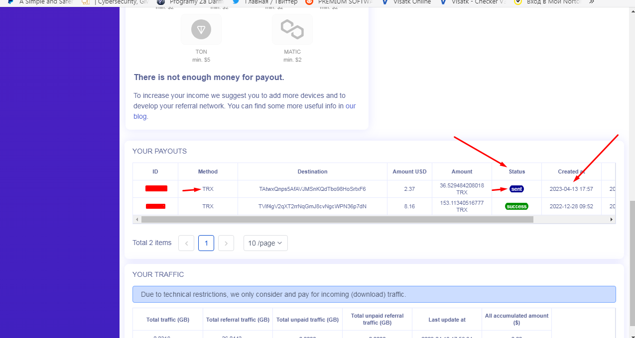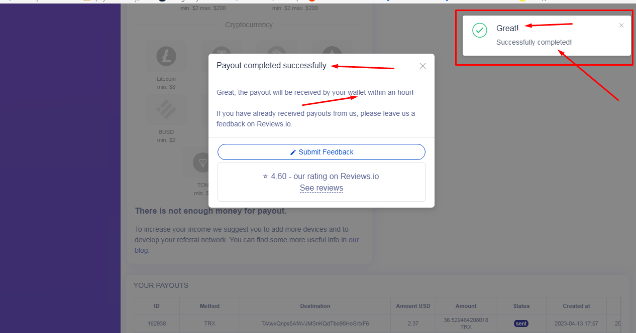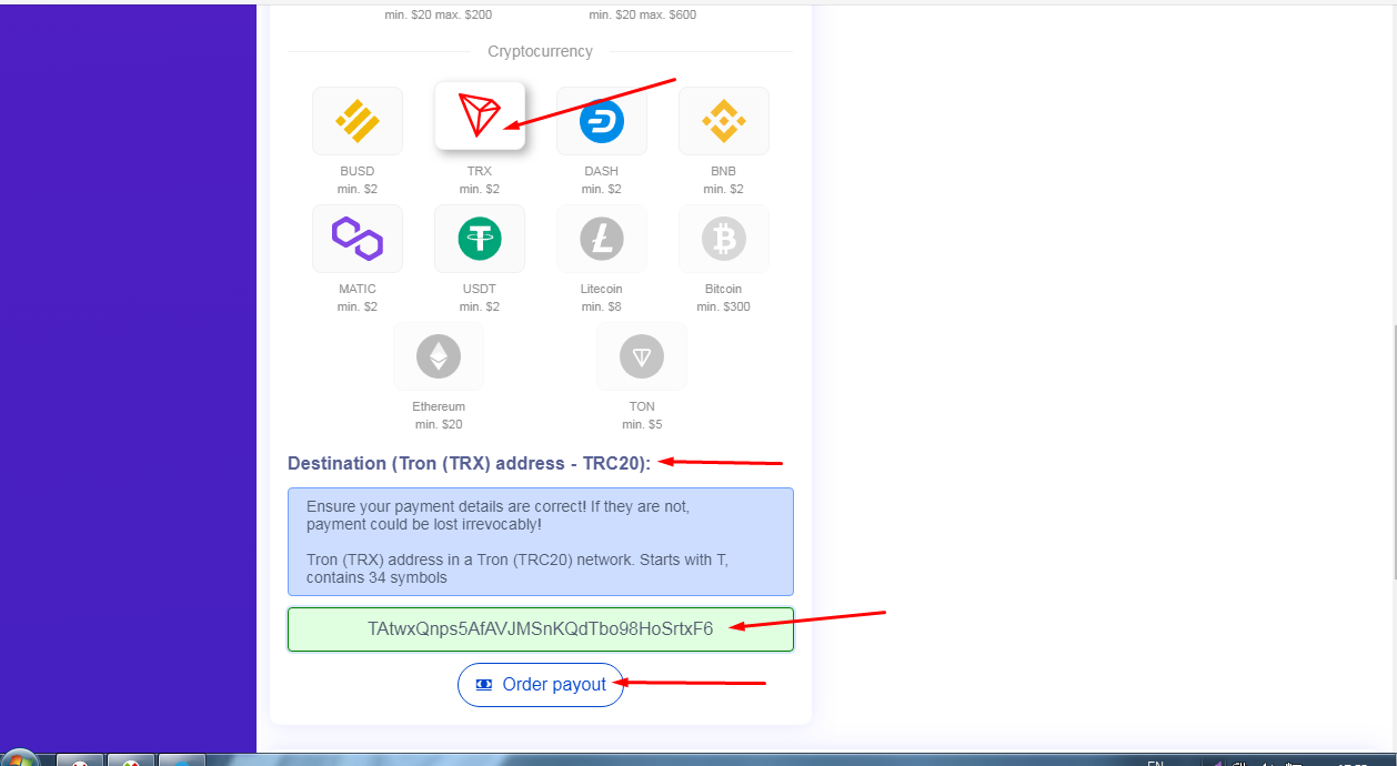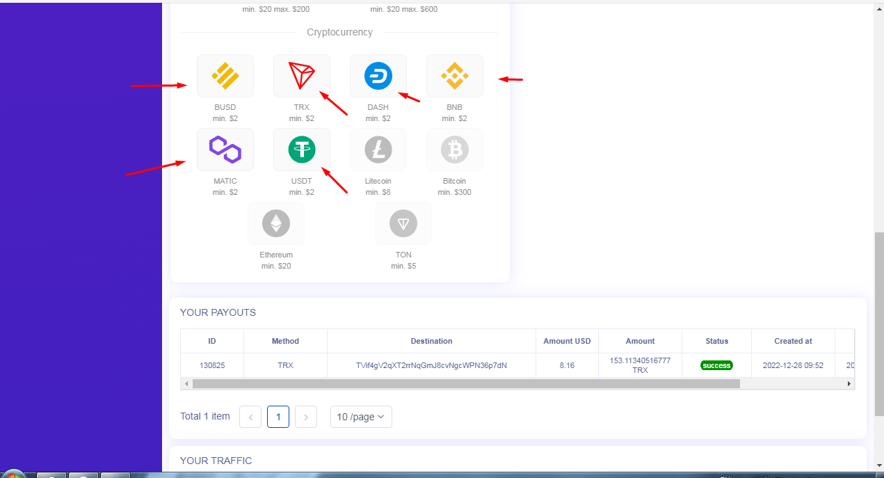 With this program, you can earn: Litecoin, USDT, Bitcoin, Ethereum, BUSD, TRX, DASH, BNB, TON, MATIC. You can also withdraw earned funds to electronic wallets: Qiwi, Yoomoney, Bank Card, Webmoney, Perfect Money, Payeer.
