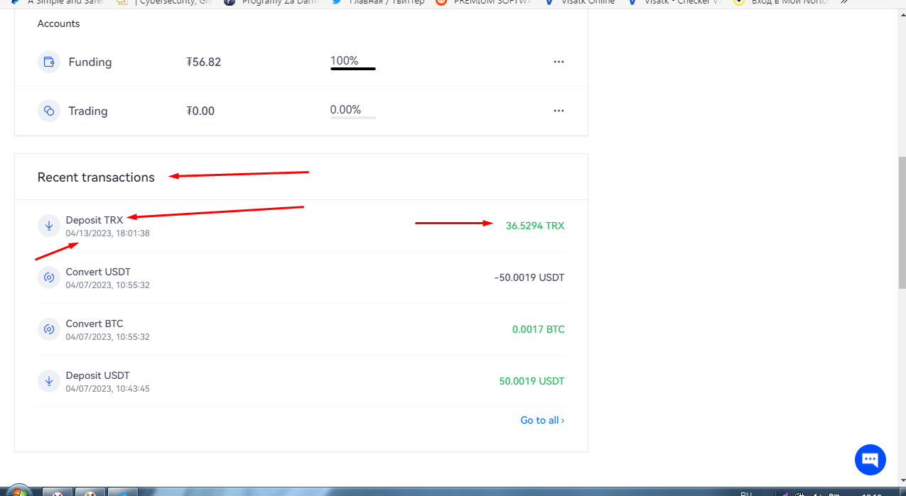 Here is the transfer in "TRX" to my account on the "OKEX" exchange
