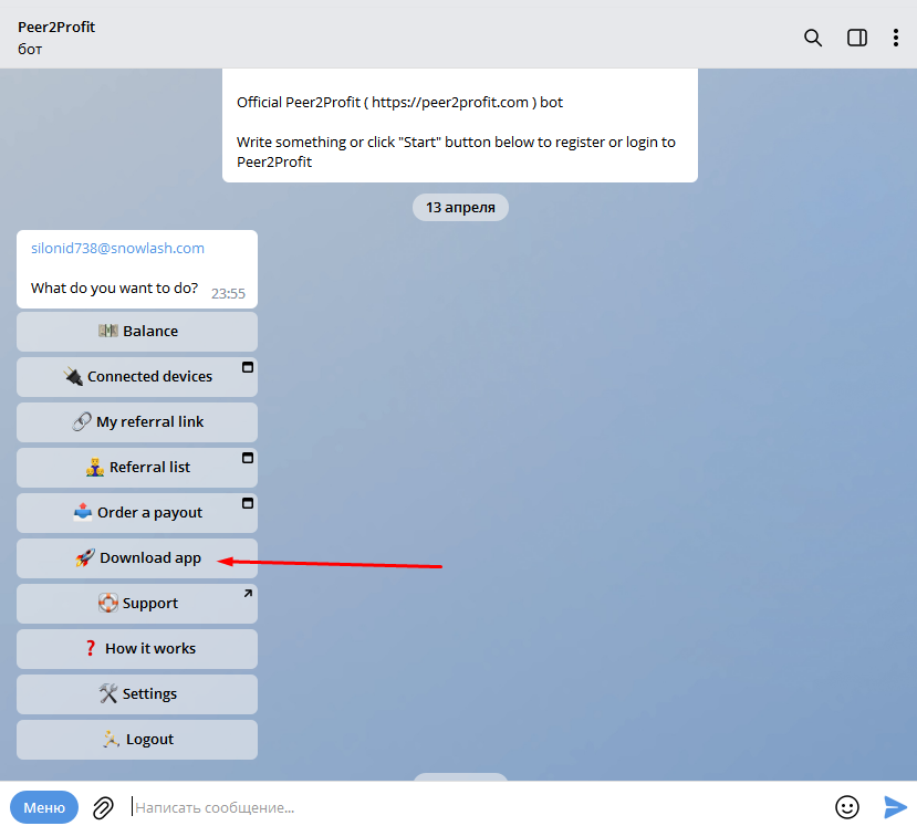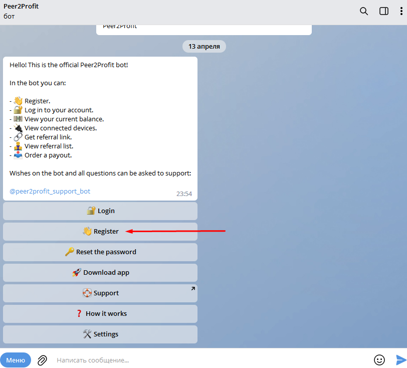 Just register in Telegram and enter this link. https://t.me/peer2profit_app_bot?start=1651610771627194932f96c