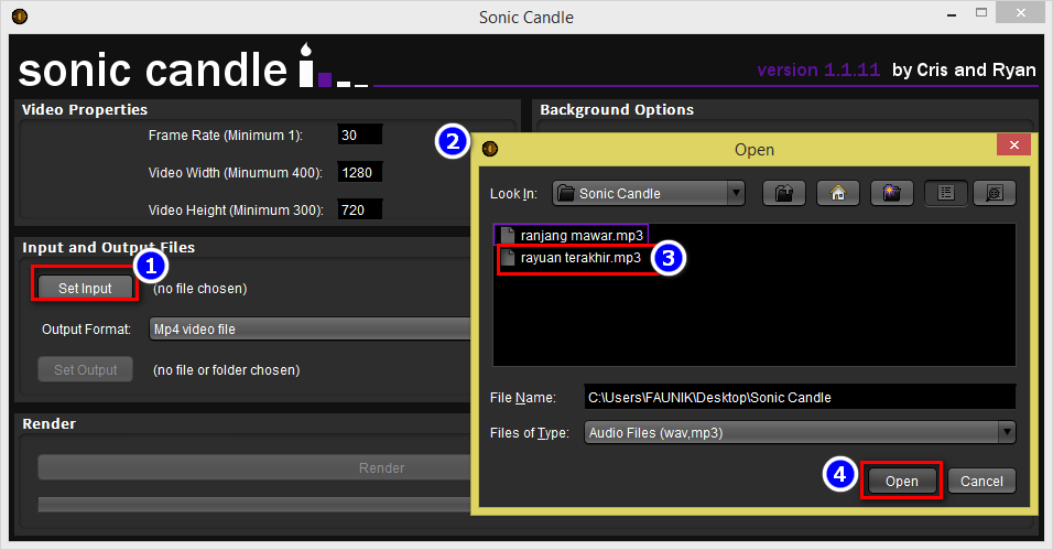 2. Input and Output File...seting untuk kita masukkan fail mp3 dan output ke mp4