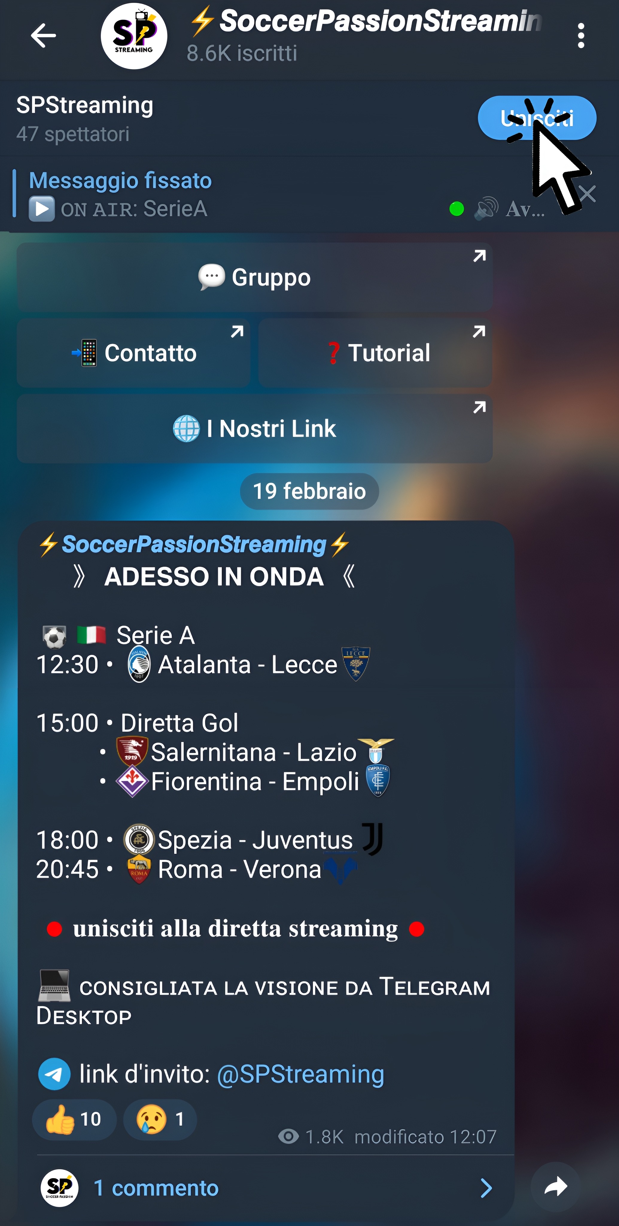 TUTORIAL PER AVVIARE LO STREAMINGPer avviare lo streaming dovrai cliccare il bottone "Unisciti" in alto a destra: