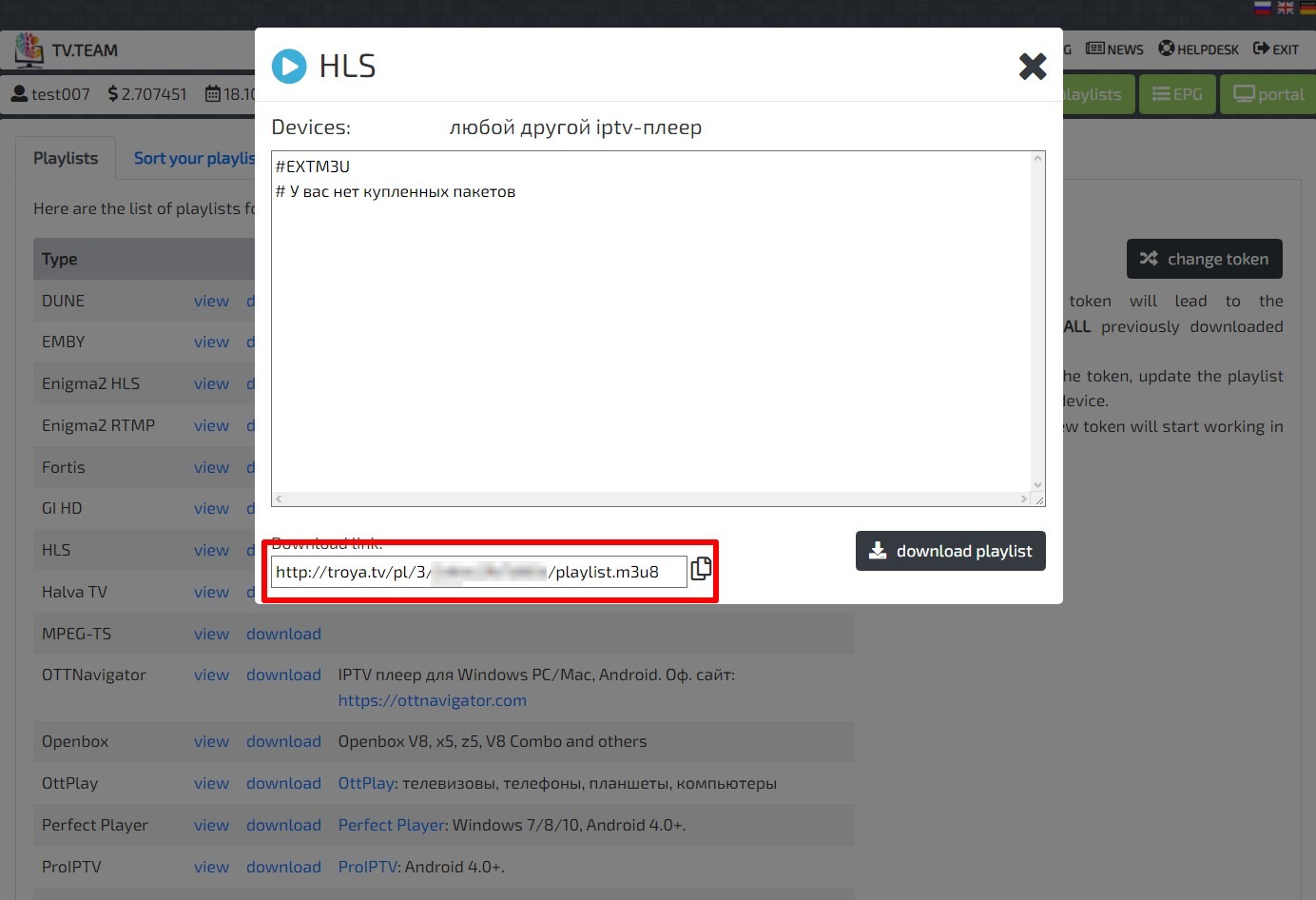After that, if you have the Streaming Player viewing type selected, go to the PACKETS section, and click PLAYLISTS. In the PLAYLISTS section you can not only download the playlist you want, but also see the token (shaded red on the screenshot) - this is your unique access key.