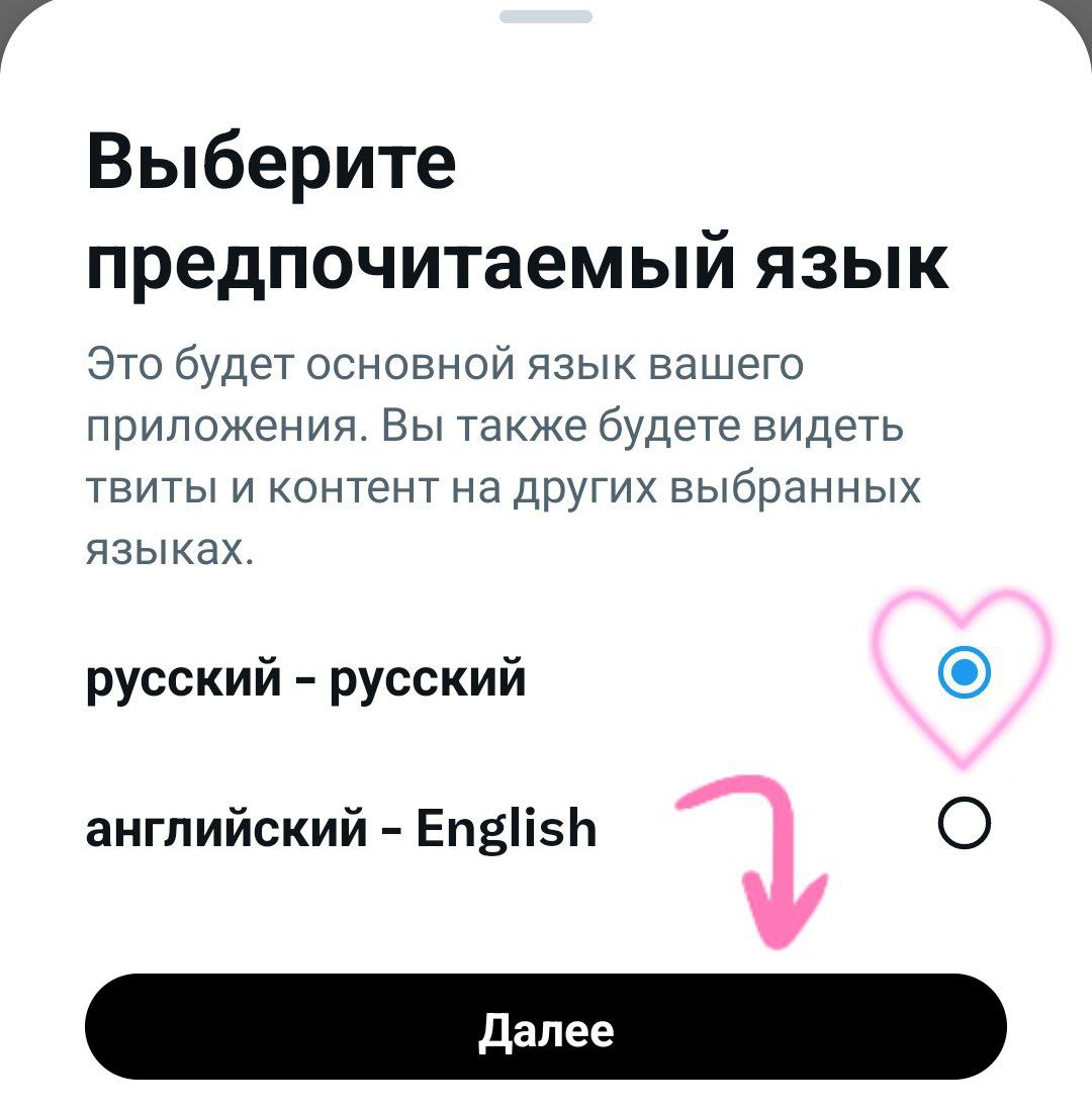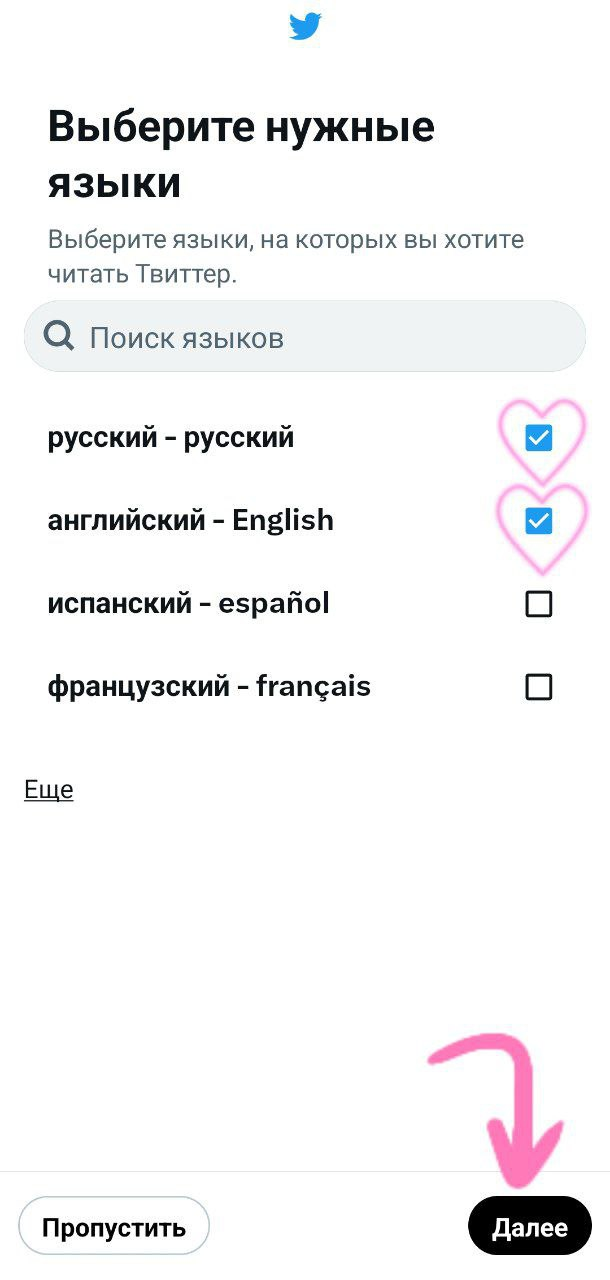 Выбираем языки, на которых будут публиковаться твиты и нажимаем "Далее". Затем выбираем язык приложения и так же нажимаем "Далее".