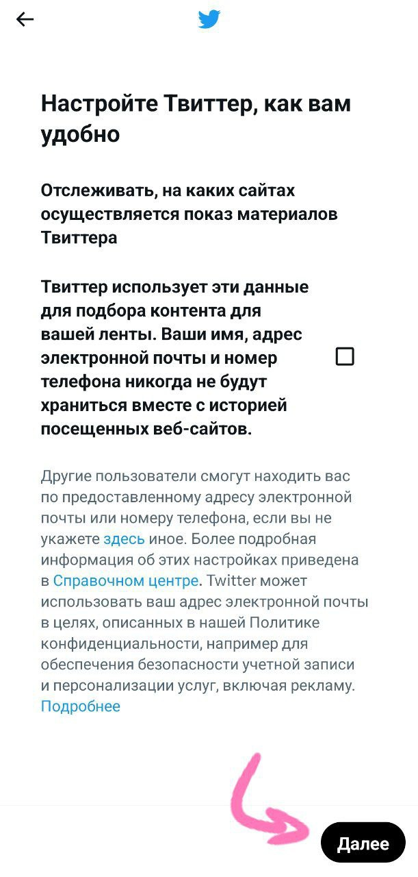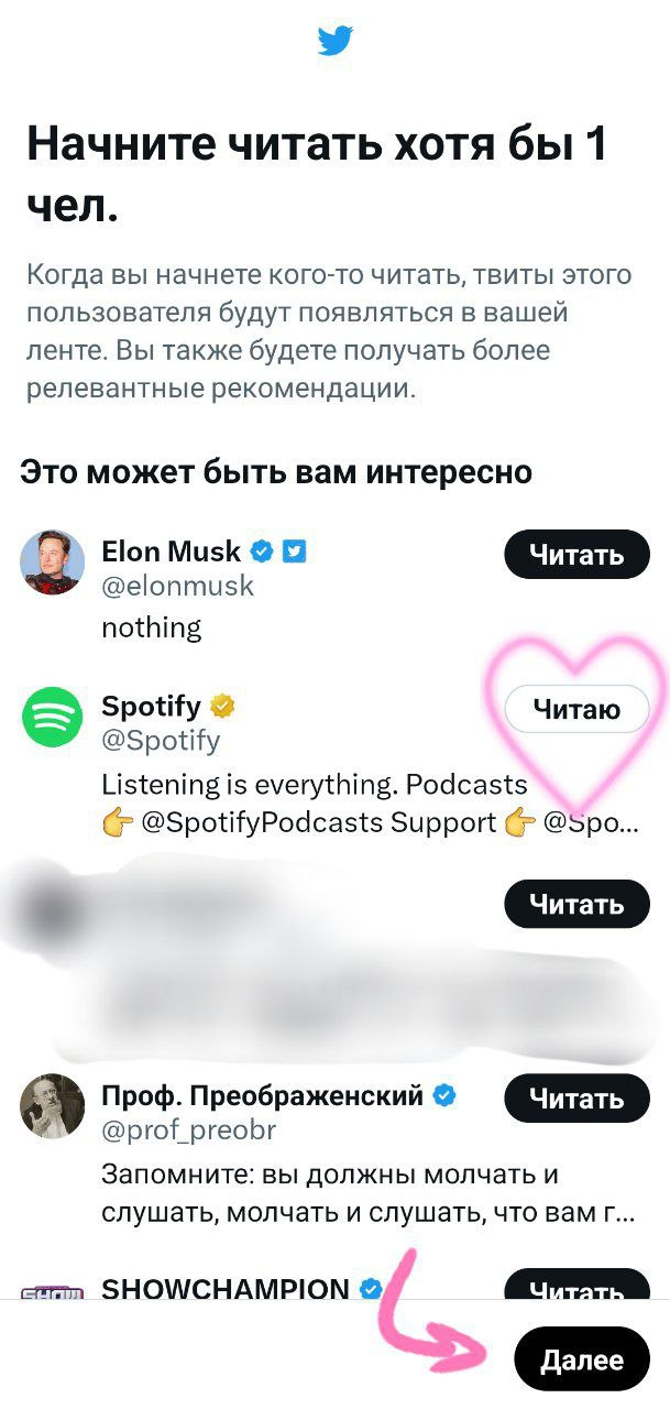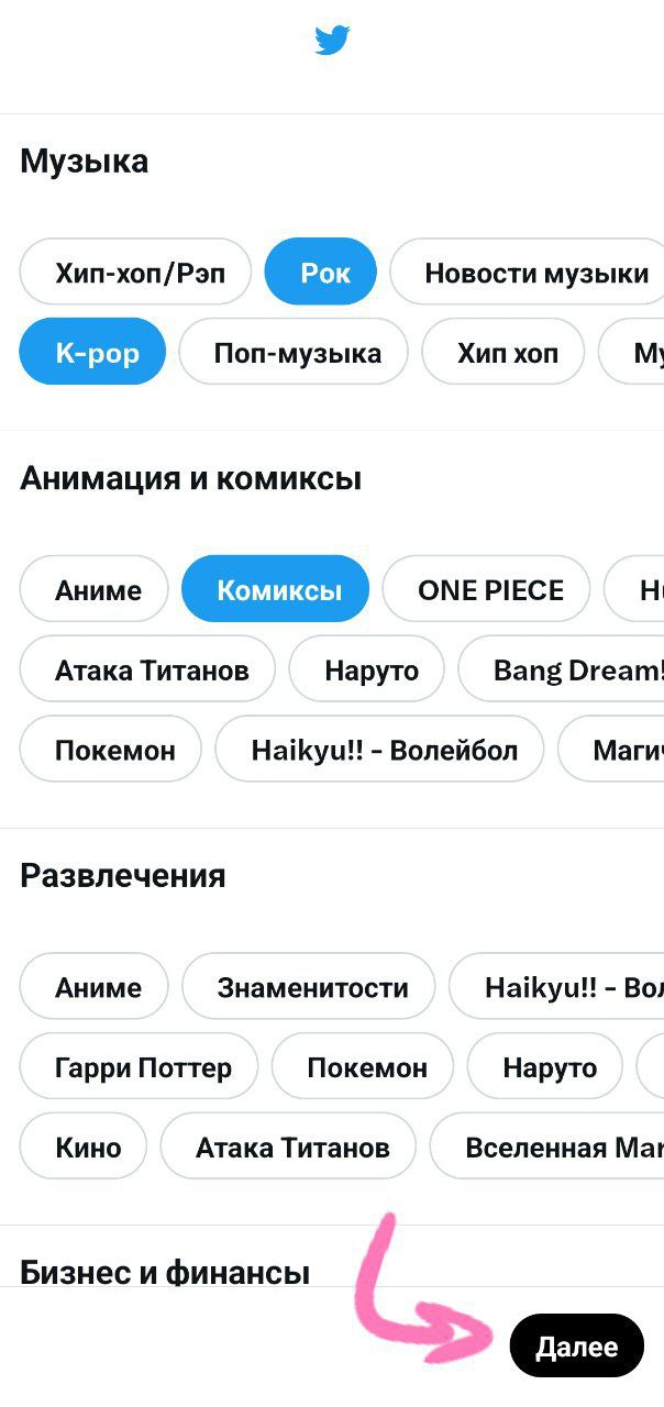 Выбираем интересующие темы (не менее 3-х), на основе которых будут рекомендоваться аккаунты и твиты. Нажимаем "Далее". Затем подписываемся хотя бы на 1 из предложенных аккаунтов и нажимаем "Далее".