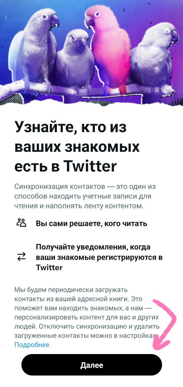 Затем приложение захочет синхронизировать контакты. Сначала нажимаем "Далее", на всплывающем системном окне "Разрешить доступ к контактам" выбираем "Нет/Отклонить".