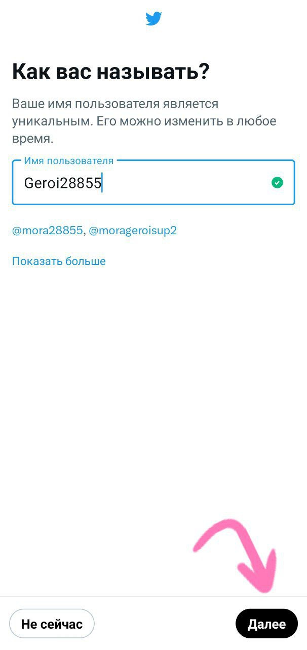 Вводим имя пользователя (слово, которое будет стоять после @). Придумываем своё или выбираем из предложенных. Нажимаем "Далее".