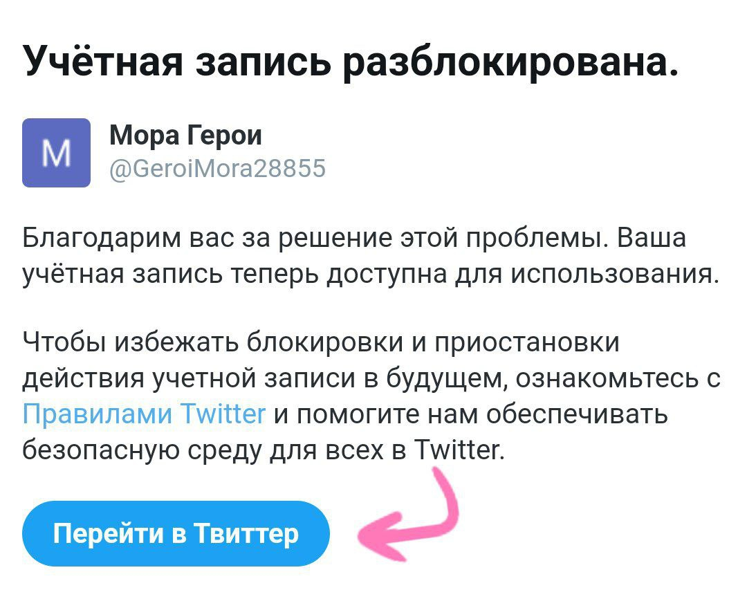 После успешно пройденной аутентификации появится окно о разблокировке вашей учётной записи. Нажимаем "Перейти в Твиттер".