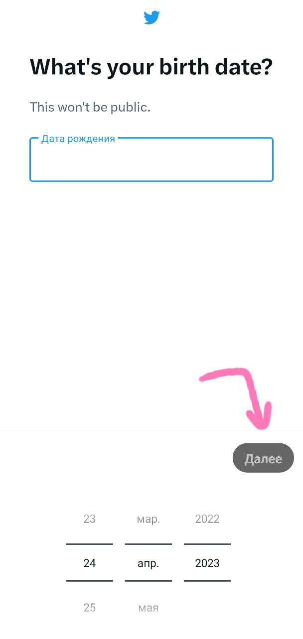 Вводим свой день рождения (рекомендуем поставить возраст от 18 лет). нажимаем "Далее".