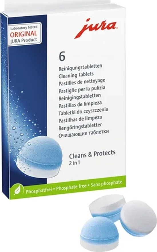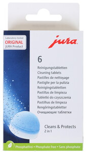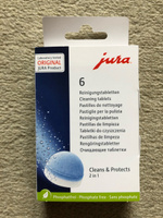 Jura Таблетки для чистки гидросистемы, 6шт . Таблетки для чистки Jura применяются для очистки гидросистемы от кофейных масел, оседающих на внутренних стенках трубок . Чистку кофемашины необходимо производить после приготовления машиной около 200 порций кофе .
