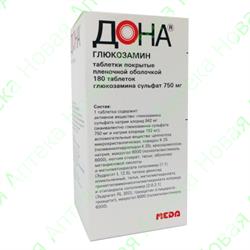 Выпускается фармкомпанией Роттафарм, принадлежащей крупному фармацевтическому концерну Меда Фарма . Таблетки Дона внешне продолговатые, белого цвета, покрытые оболочкой, при разламывании или разрезании можно увидеть внутренний - коричневато-белый слой . Действующее вещество - глюкозамина сульфат 750 мг .