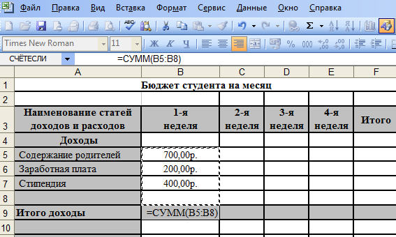 Таблица бюджета студента