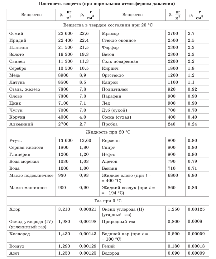Таблица плотностей 5 класс