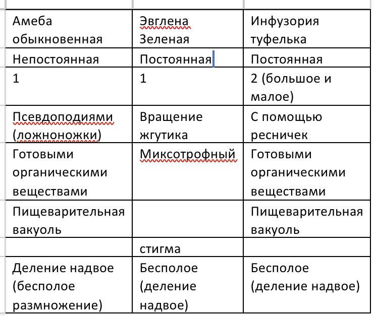 Таблица по биологии многообразие простейших