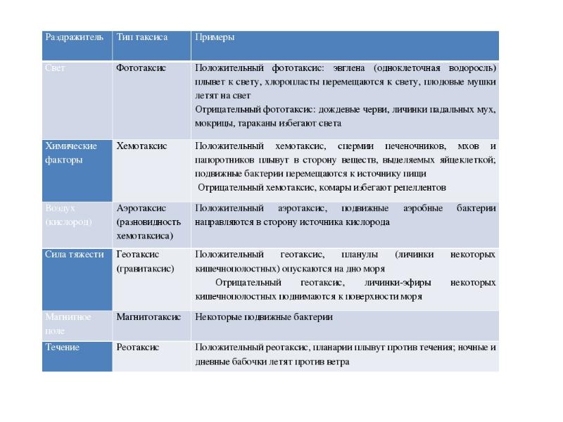 Таблица раздражимость