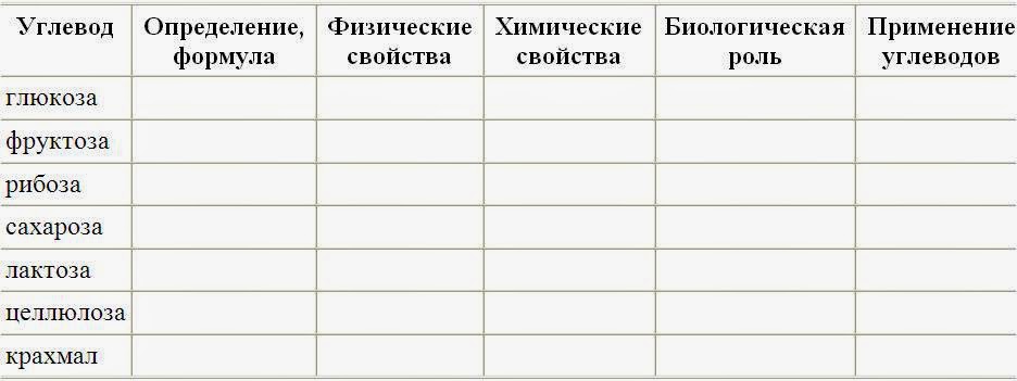 Таблица углеводов в биологии