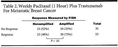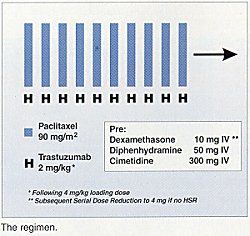 Согласно предварительным результатам еще не завершенного испытания по Фазе ii, еженедельное применение паклитаксела (ТАКСОЛ) в комбинации с трастузумабом (герцептин) обнаруживает . . .