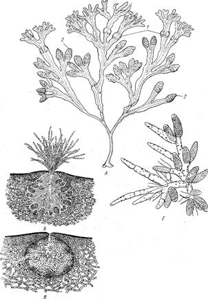 Таллом многолетний, имеет вид дихотомически разветвленного кустика . . . . У некоторых видов фукуса по бокам от срединной жилки расположены вздутия, . . .