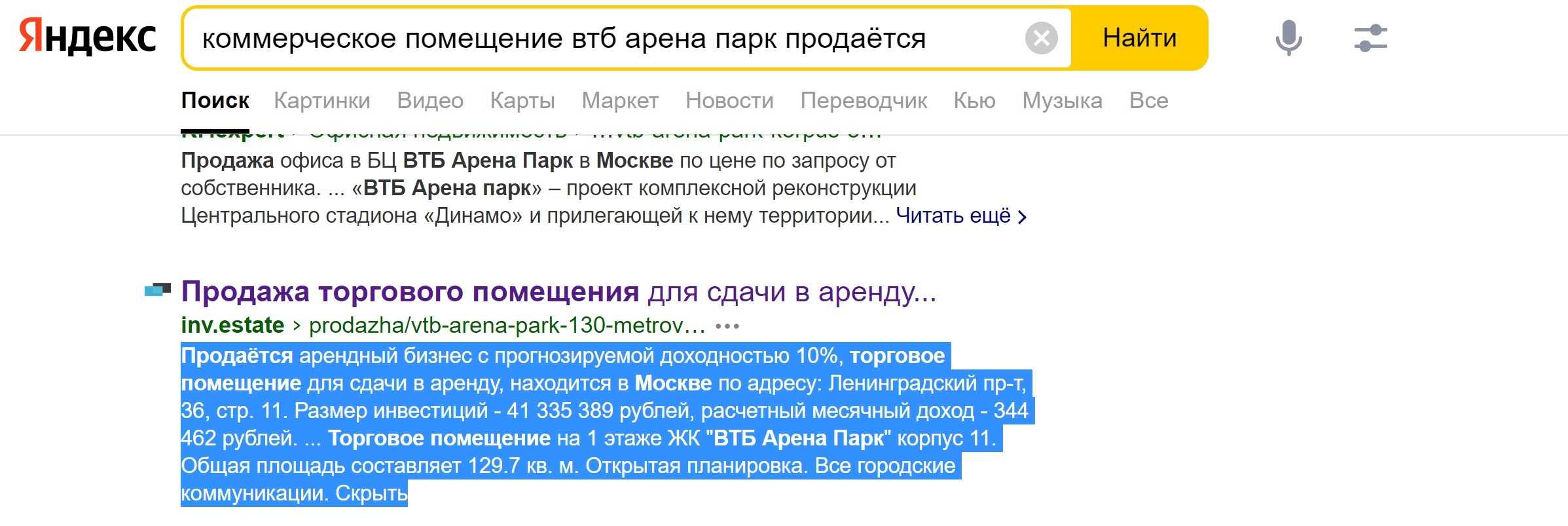 Третий актив — нежилое помещение. Сотрудники ФБК* не потрудились его оценить точно. Лишь сказали, что общая стоимость недвижимости аж 300 миллионов. Можно смело вычитать остальные оценки 300-130 (квартира на Ленинградском)-45 (квартира на В.Масловке)=125 миллионов. Немного высоковато даже для такой площади. Честно признаюсь, что тут у меня возникли проблемы — коммерческие площади первых этажей в ЖК давно распроданы и следов этих объявлений не найти. Но в кэше всё-таки одно обнаружилось — вот этот магазинчик не так давно ушёл за 41 миллион 335 тысяч. Пересчитав за метр и перемножив на площадь помещения, которое нам нужно, получим 57,74 миллиона. Конечно, площадь могла стоить дороже, но не в два раза.