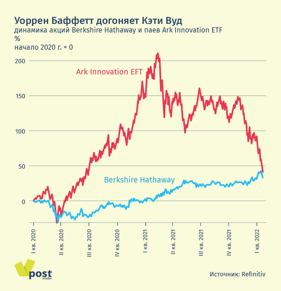 В результате с начала 2022 г. по закрытие пятницы паи Ark Innovation ETF подешевели на 24%, а акции Berkshire Hathaway выросли на 2%. А с начала 2021 г. фонд упал на 43%, тогда как капитализация компании Баффетта выросла на 34%. И теперь разница в их динамике за период пандемии (с начала 2020 г.) составляет всего 8 процентных пунктов – при гораздо меньшей волатильности у Berkshire Hathaway.