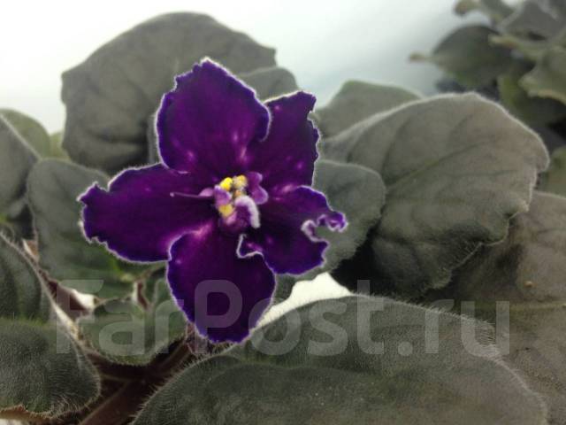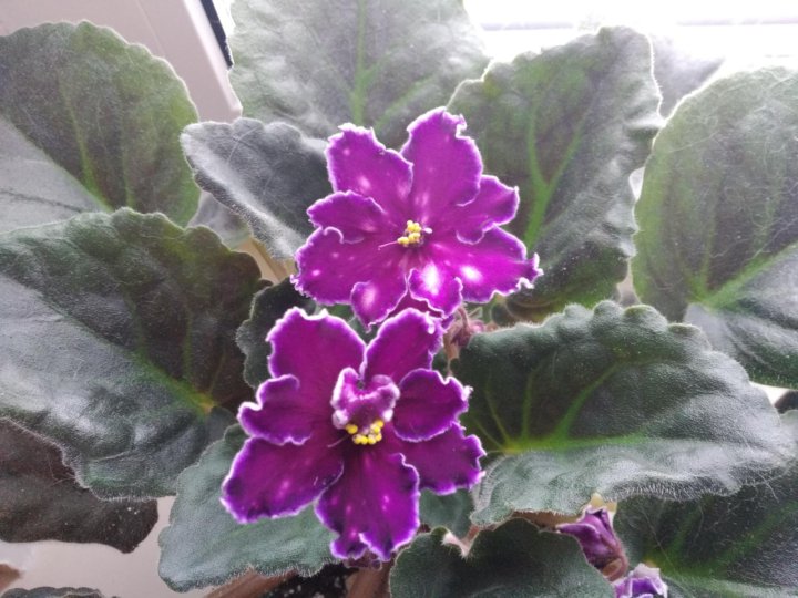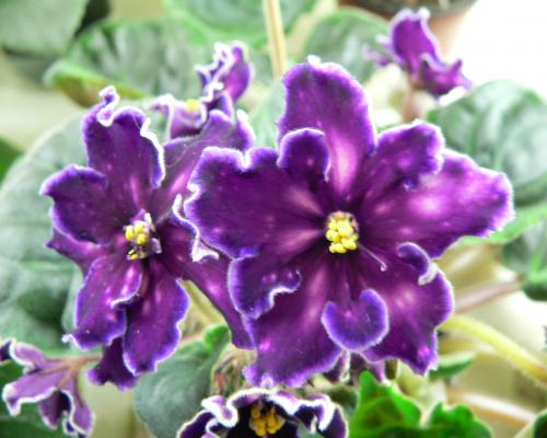 Удивительная фиалка Танец Галактик . Крупные ярко-пурпурные звёзды, кайму которых к концу лепестка сгущается в фиолетовый цвет . Цветок имеет форму звезды и затемнения по краям лепестков .
