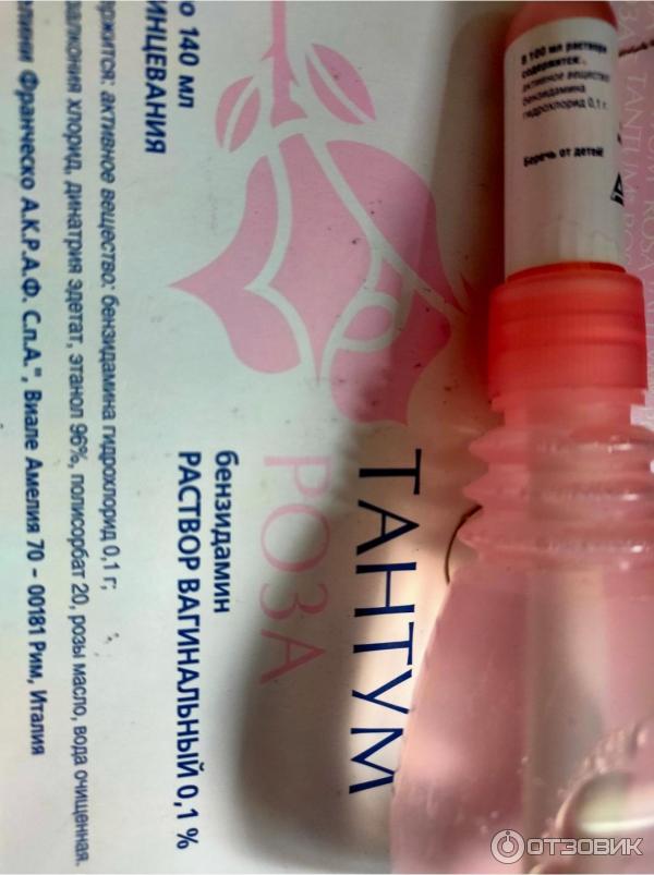 Форма выпуска, упаковка и состав препарата Тантум ® Роза Раствор вагинальный 0 .1% бесцветный, прозрачный, с характерным запахом роз . Вспомогательные вещества: бензалкония хлорид, динатрия эдетат, этанол 96%, полисорбат 20, масло розы, вода очищенная .