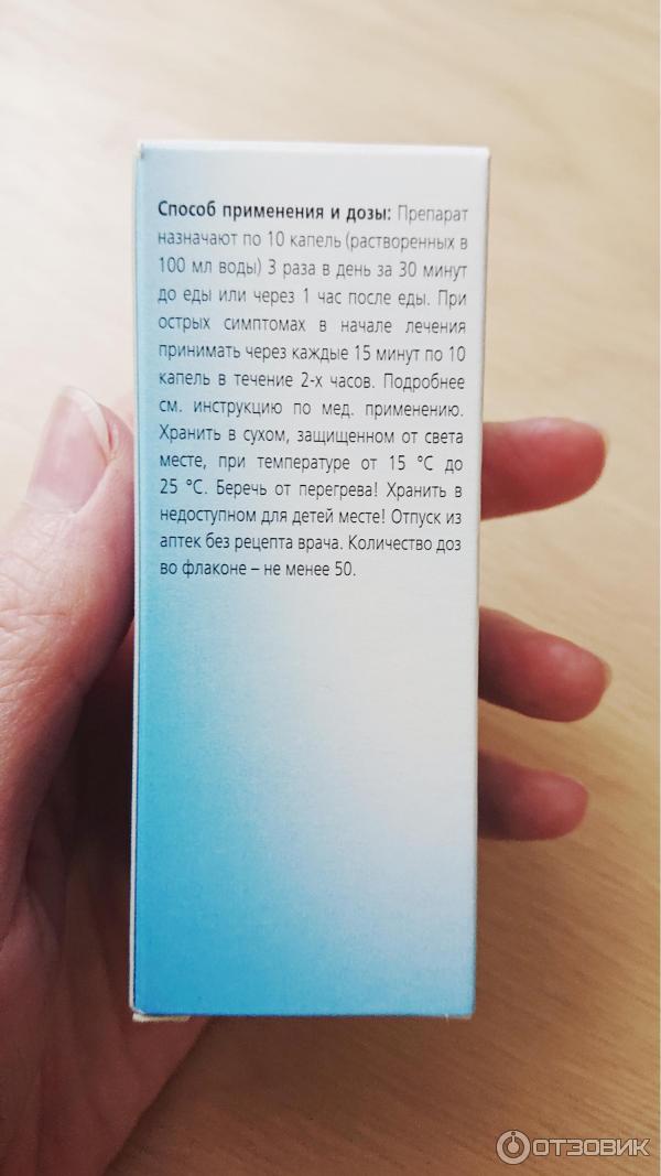 Способ применения и дозы Внутрь, 3 раза в день за 30 мин до или через 1 ч после еды по 10 капель (растворенных в 100 мл воды) . При острых симптомах в начале лечения принимать через каждые 15 мин по 10 капель в течение 2 ч . Длительность лечения составляет в среднем 2-4 нед . Увеличение продолжительности курса лечения возможно по рекомендации врача .