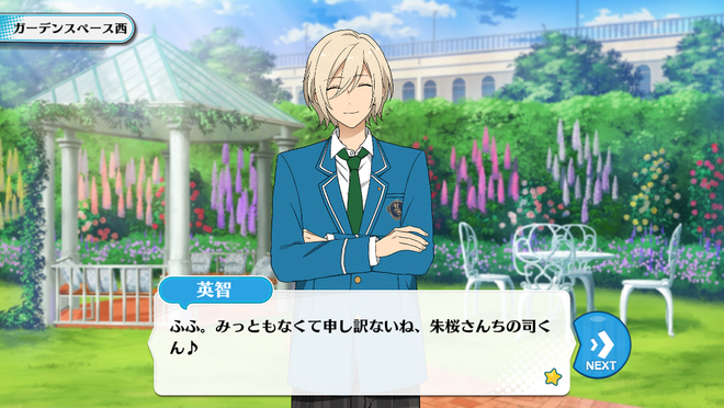 Эйчи: Хаха. Цукаса-кун, что ты делаешь в этих кустах? Это не очень элегантно. Хочешь тоже присоединиться к нашему чаепитию?