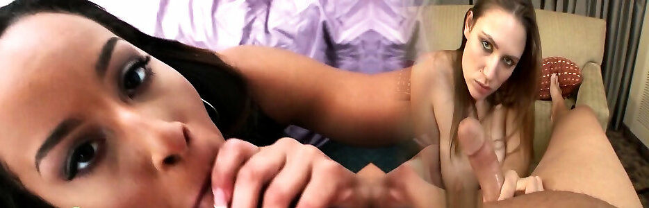 Zwei schwarzhaarige Girls blasen einen harten Schwanz