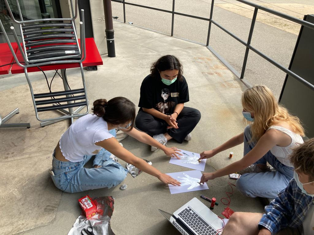 Da wir zu Beginn des Workshops mit Stromkreisen gearbeitet haben, kamen wir auf die Idee, einen in einem unser Rätsel zu verwenden. Wir wissen, dass der menschliche Körper Strom leitet. Daher dachten wir, wir könnten diese zwei Elemente verbinden. So sind wir auf die Idee gekommen, einen Stromkreis zu installieren, den die Spieler durch ihre Körper verbinden müssen und der bei Stromfluss den Tipp ausgibt. Nachdem man im vorherigen Schritt das Passwort für den Computer gefunden hat, bekommt man einen Hinweis. Dieser lautet "Die Hände sind der Weg zur Freiheit". An die Wände haben wir zwei Handabdrücke aus Aluminium geklebt. Diese sind verbunden durch einen stromleitenden Draht, der widerrrum an den Computer per Makey Makey angeschlossen ist. Berührt eine Person jetzt die eine Hand, eine Andere Person die andere Hand und halten sie sich mit einer dritten oder sogar vierten Person an den Händen, verbinden sie so den Stromkreis, da der Strom durch den Draht, die Hand, dann die Menschen, die andere Hand und wieder den Draht fliesst. Die Spieler müssen also mit ihren Körpern den Stromkreis vervollständigen. Der Computer spielt dann die Audiodatei "Schaue nach unten und drehe es nach Norden" ab und dieser Teil des Rätsels ist beendet.