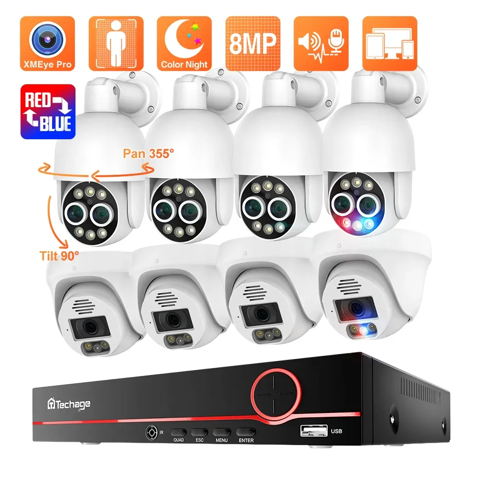 Techage Smart Security H.265 8MP 8CH POE Camera Set AI Human Detected Dual Lens PTZ POE Camera Colorful Night Video CCTV P2P - Купить с бесплатной доставкой