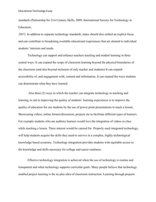 Free Educational Technology Essay Sample . Technology that can be used to enhance and support student learning comes in many different forms . This ranges from video content, laptop computing, technologies that are handheld, digital movie making and so on . All these forms have been in active use in the classroom and new forms of technologies for . . .