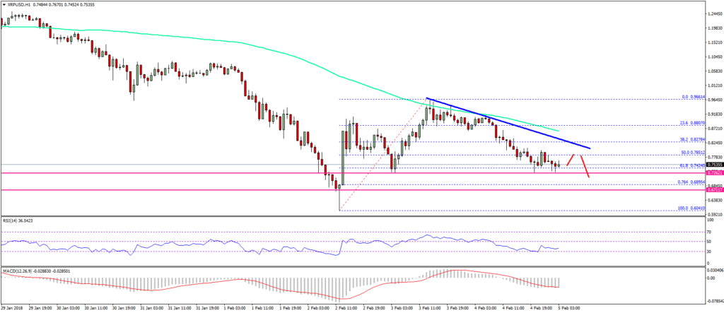 Что еще более важно, движение вверх было защищено главной медвежьей трендовой линией с сопротивлением на 0,8000$ на часовом графике пары XRP / USD. Пара в настоящее время торгуется около области поддержки 0,7$. Кроме того, он удерживает уровень Фибоначчи 61,8% последней волны роста $ 0.6041 до $ 0.9661. XRP должен оставаться выше области поддержки 0,75$, чтобы избежать дальнейшего снижения. Если он не сможет остаться выше $ 0,7500, есть шанс, что XRP вернется к $ 0.7000.